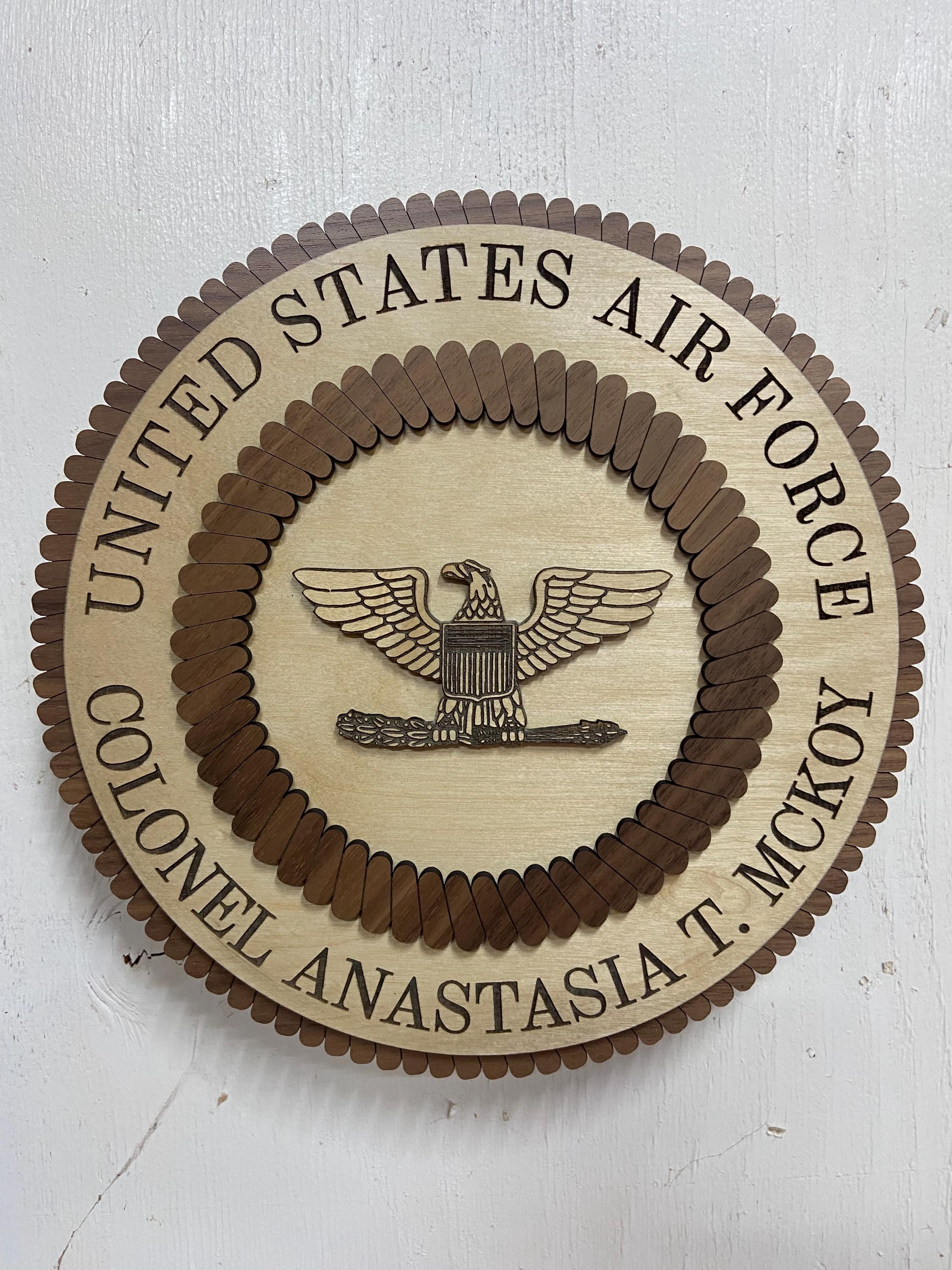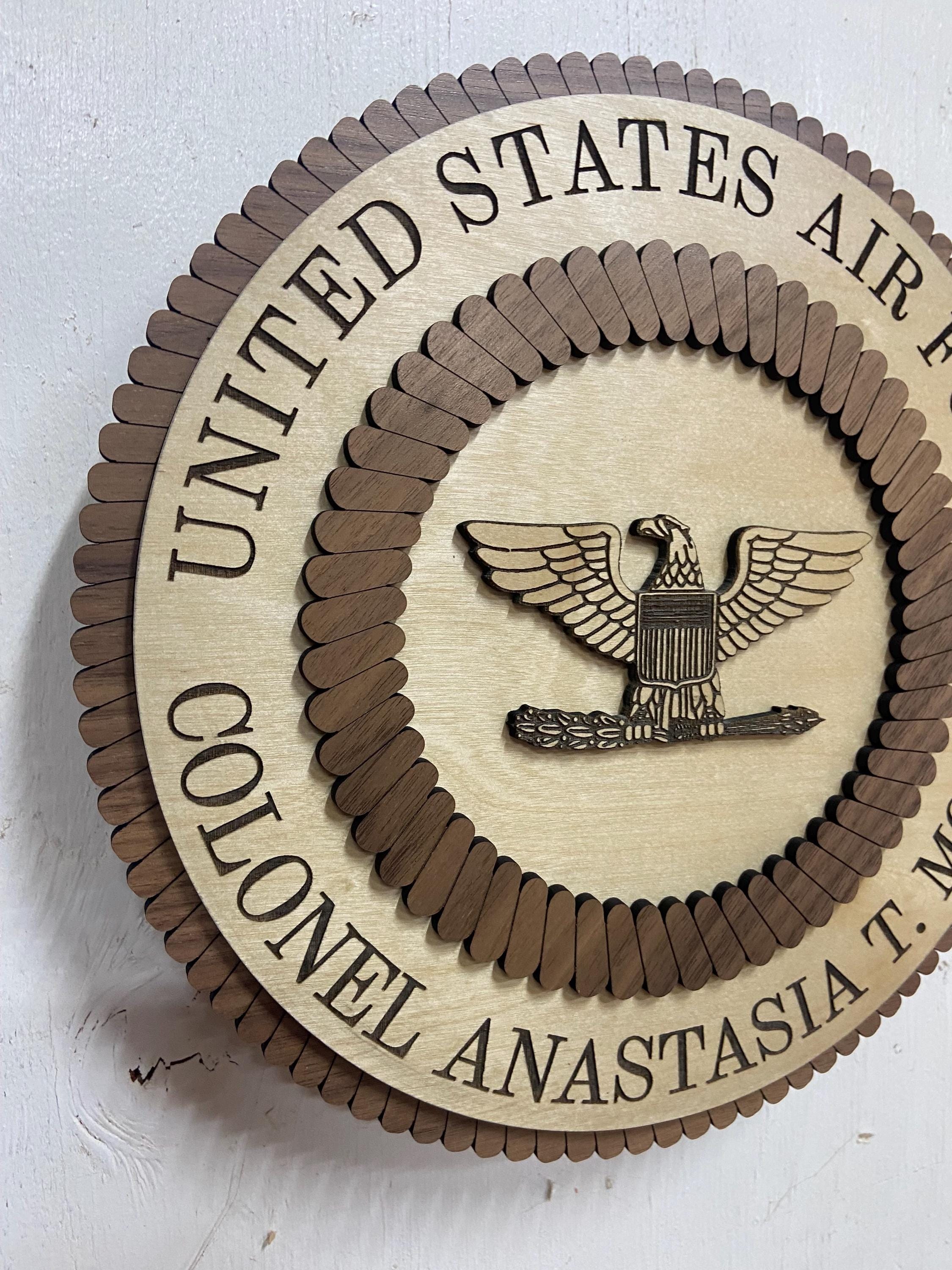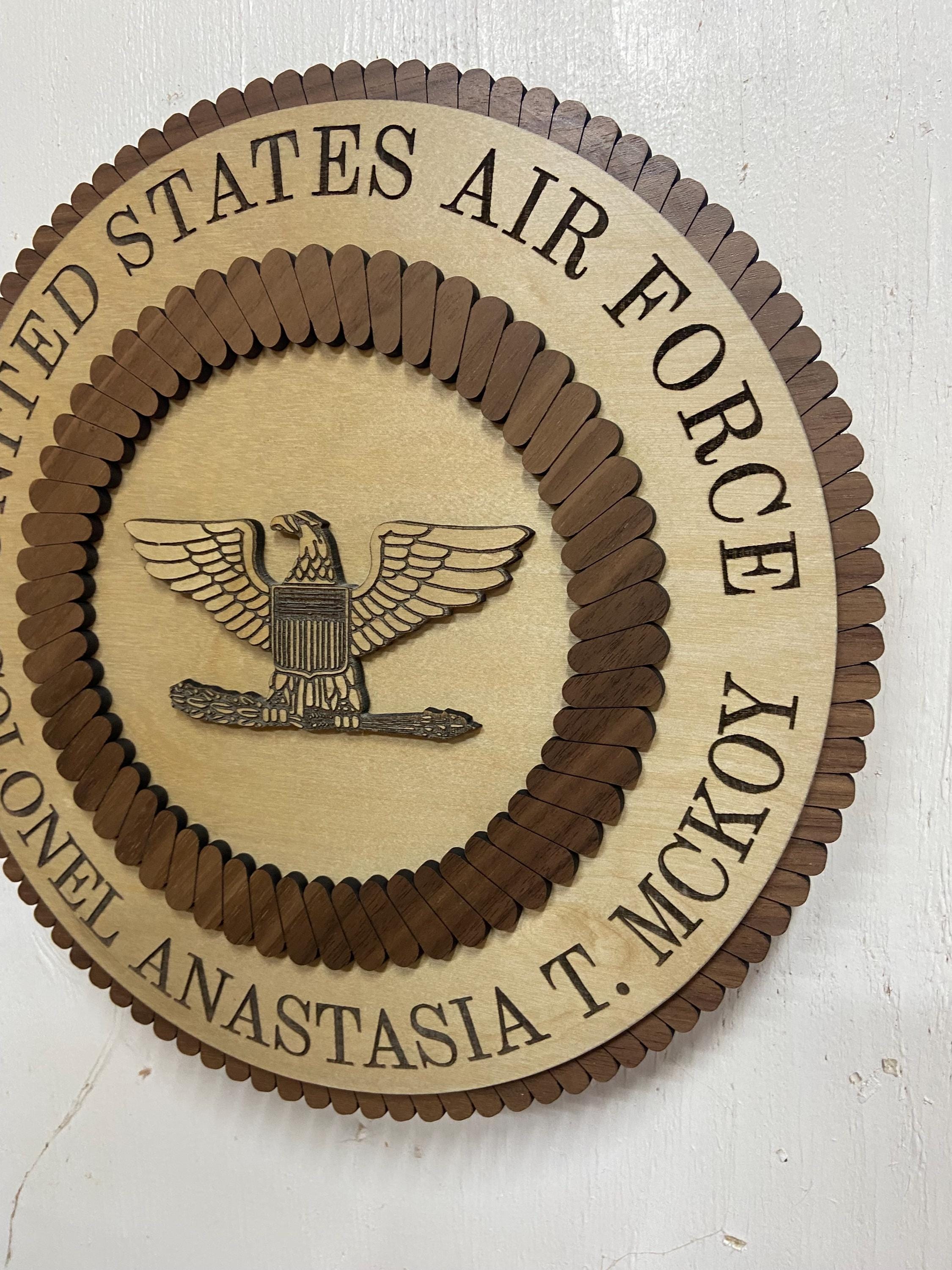 Personalized promotion plaque measures 12” in diameter. 3 layers make up this personalized 3D design! Express gratitude to troops from all services - Army, United States Navy, Air Force, Marines, Space Force, National Guard and Coast Guard.